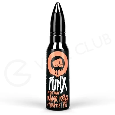 Mango, Peach & Pineapple shortfill e-liquid by Riot Squad Punx is a fruit blend noted for its contrasting flavours. A smooth, fragrant peach and ripe-tasting mango create a sweet inhale, swiftly followed by a sharp pineapple for distinct e-liquid.