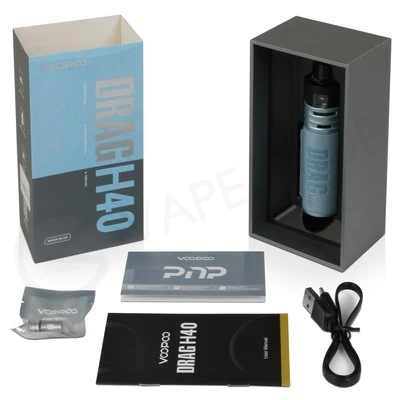 The VooPoo Drag H40 vape kit boasts cutting-edge design and functionality, and serves as a good introduction to sub ohm vaping. Itโs powered by a built-in 1500mAh battery, which lets you vape for longer between charges and will deliver a 5-40W power output range, supporting both DTL (Direct To Lung) and MTL (Mouth To Lung) vaping. Each kit includes a 2ml PnP Pod II, which features a straightforward airflow design. Itโs compatible with the PnP series of coils, so you can tailor your vape to suit you.